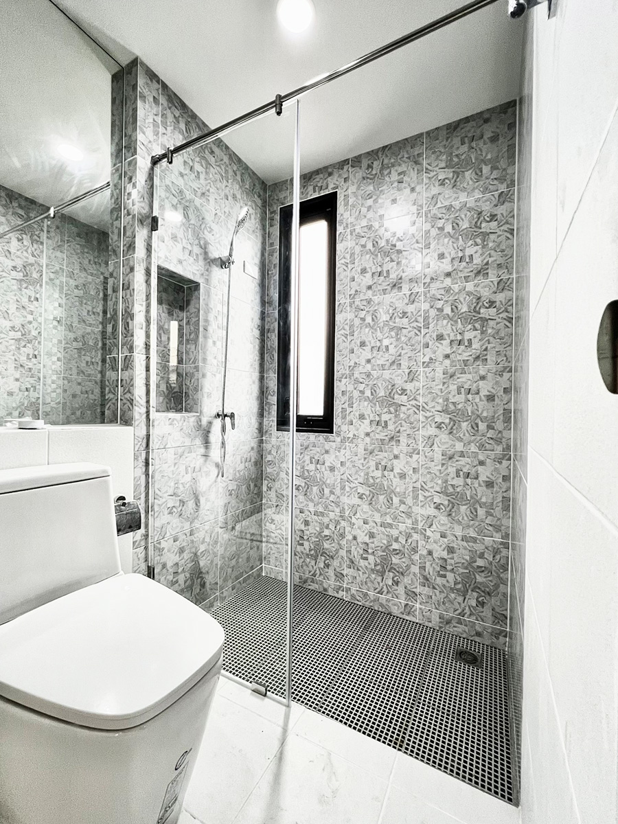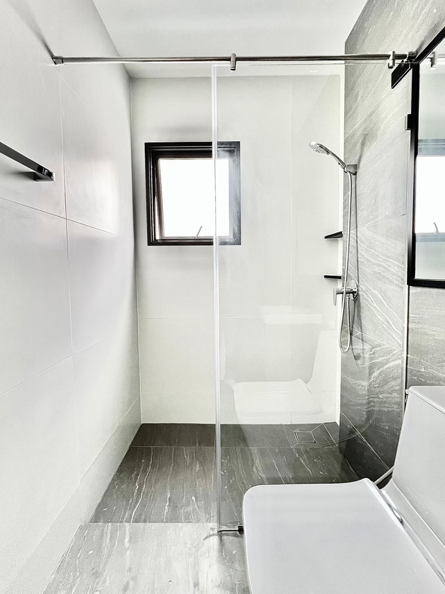 เป็นรูปแบบกระจกบานเดียว เว้นช่องทางเดิน เข้า-ออก ไม่มีประตู ติดตั้งคานสแตนเลสยึดด้านบน เพื่อลดการสั่นและเพิ่มแข็งแรง และติดตั้งด้วยกระจก Tempered Glass มาตรฐาน มอก. หนา 10 มม. แข็งแรง ปลอดภัย และอุปกรณ์ยึดกระจกสแตนเลส 304