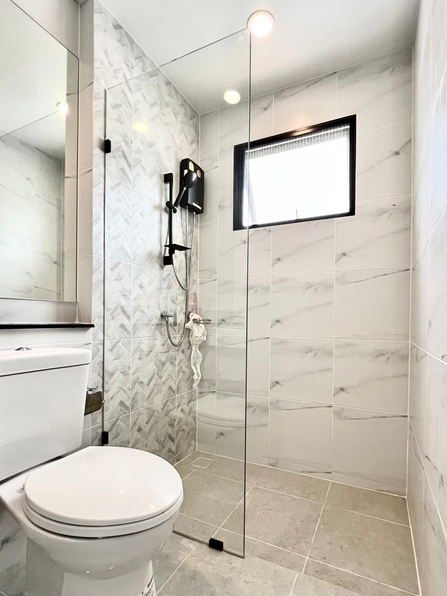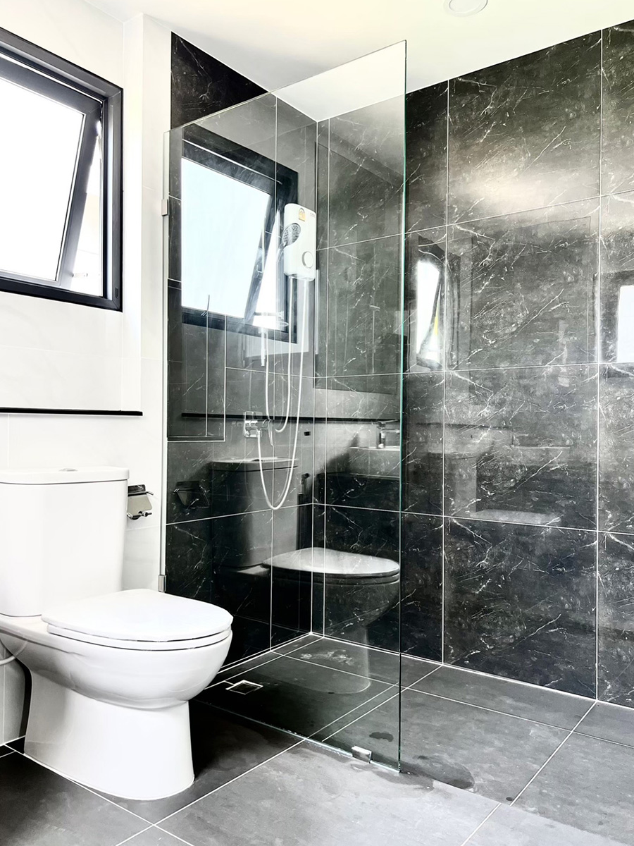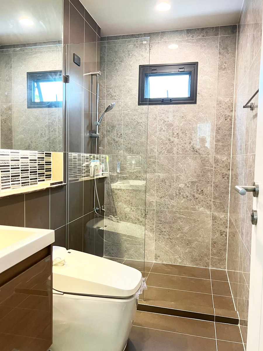 เป็นรูปแบบกระจกบานเดียว เว้นช่องทางเดิน เข้า-ออก ไม่มีประตู ติดตั้งแล้วไม่อึดอัด ทำความสะอาดง่าย ติดตั้งด้วยกระจก Tempered Glass มาตรฐาน มอก. หนา 10 มม. แข็งแรง ปลอดภัย และอุปกรณ์ยึดกระจกสแตนเลส 304