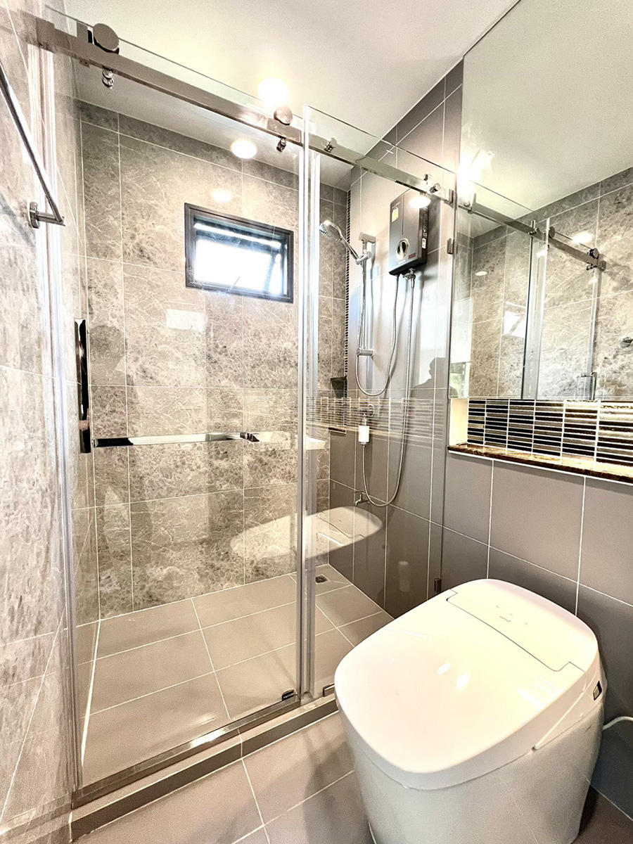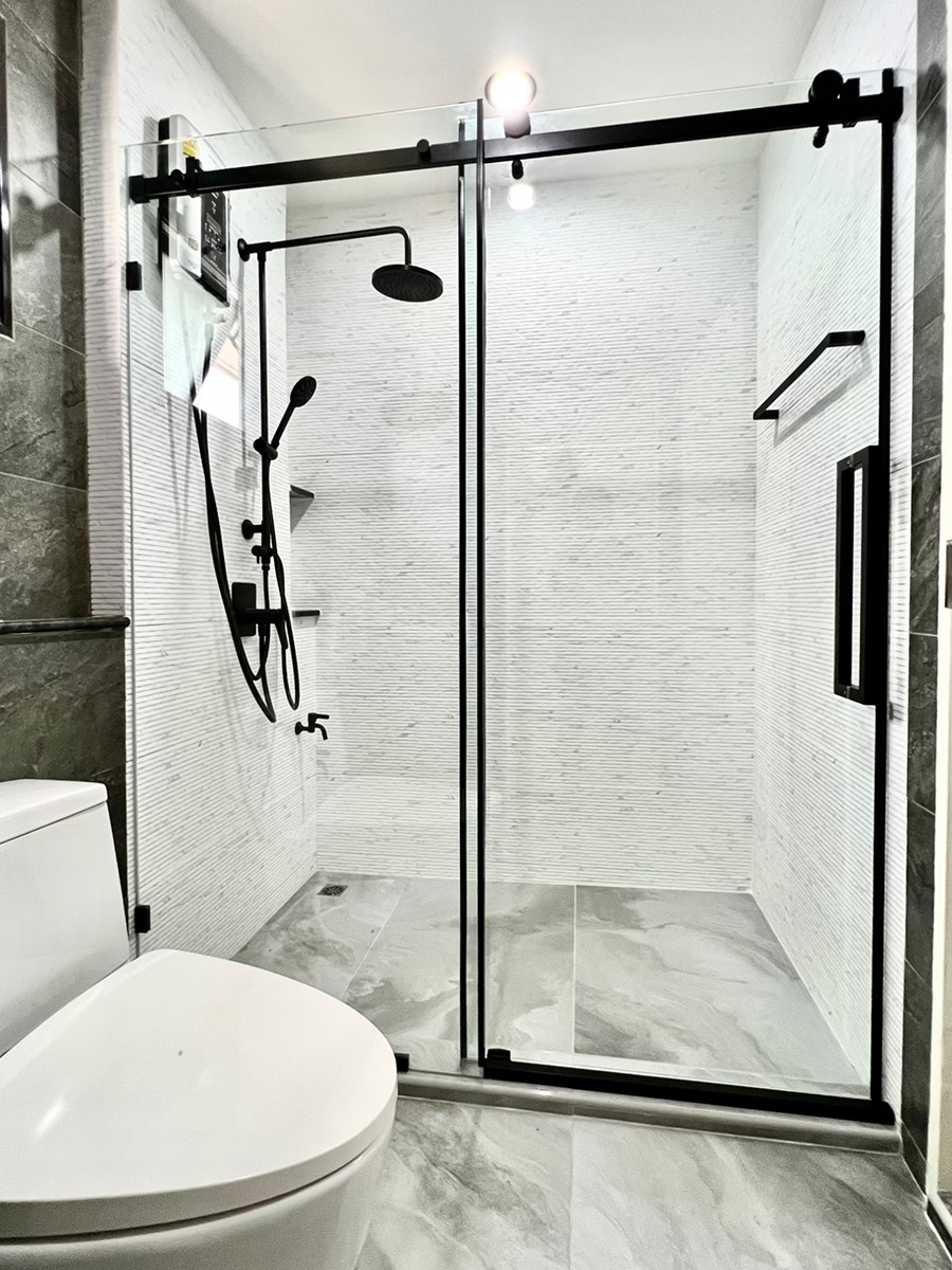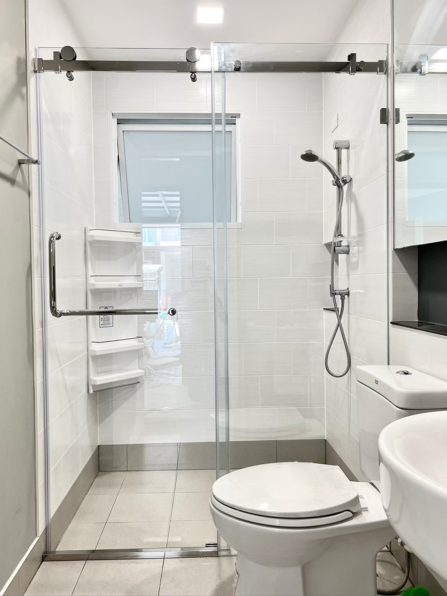 กระจกกั้นอาบน้ำที่ติดตั้งเข้ากับโซนเปียกที่แยกพื้นที่เป็นส่วนเปียกและส่วนแห้งแนวตรง ประตูสามารถปรับให้เลื่อนด้านซ้ายหรือขวาขึ้นอยู่กับพื้นที่หน้างานจริงสามารถป้องกันน้ำได้ดี แข็งแรง ทนทาน ดูแลรักษาและทำความสะอาดง่าย ติดตั้งด้วยกระจกนิรภัย Tempered Glass ความหนา 10 มม. และชุดอุปกรณ์สแตนเลส 304 ทนทานการกัดกร่อนสูง